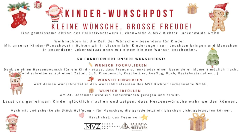Deshalb haben wir – das Palliativ Netzwerk Luckenwalde – gemeinsam mit der MVZ Richter Luckenwalde GmbH in diesem Jahr eine besondere Aktion ins Leben gerufen: die Kinder-Wunschpost.